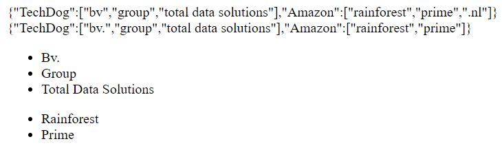 Maak een multidimensional array met een key "TechDog" met de volgende waardes: 'bv', 'group' en 'total data solutions' en een key "Amazon" met de volgende waardes: 'rainforest', 'prime', '.nl'.